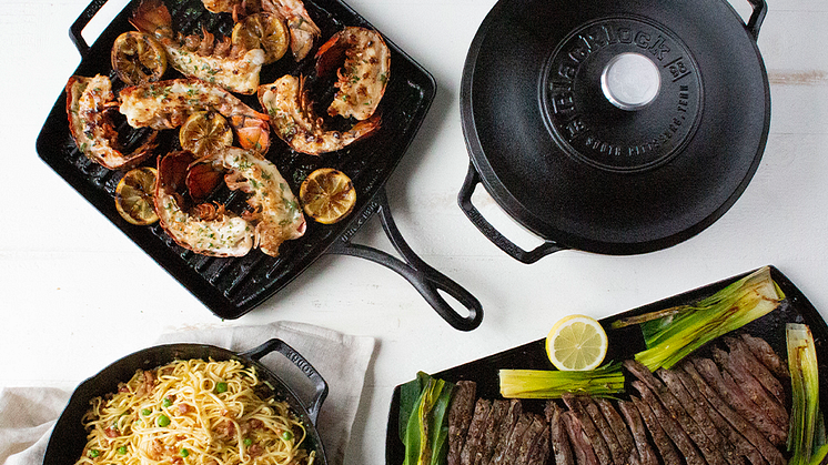 På bilden syns stekhäll, grillpanna, stekpanna och braiserpanna med lock från Lodge Cast Irons Blacklock-serie.