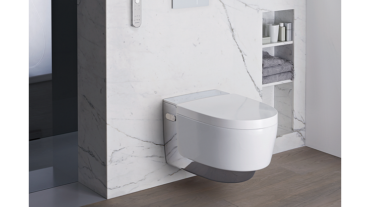 På bilden syns Geberit AquaClean, en högteknologisk duschtoalett som gör dig renare, utan papper. Toaletten har en duschfunktion som rengör med en tempererad duschstråle och torkar med varmluft, vilket innebär att Geberit AquaClean bidrar till en mer hygienisk och skonsam rengöring. Med elegant design och smarta funktioner såsom närhetssensor som öppnar locket automatiskt, sitsuppvärmning, ljudlös spolning och luktutsugning blir badrummet en hygienisk och harmonisk plats.