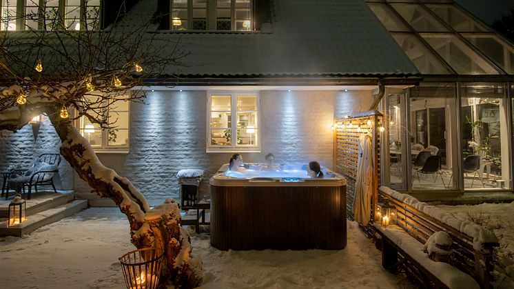 Här syns ett härligt spabad från Poolkungen som erbjuder möjligheten att njuta av sköna bubblor sommar som vinter.