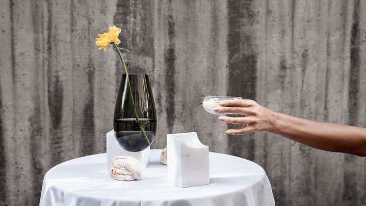 Här syns vas och cocktailglas från serien Cliffhanger, som även består av en fruktskål. Varje produkt har två separata delar, där basen är av marmor och toppen av munblåst kristall. Inspirerad av arkitektritade glashus som trotsar gravitationen på kanten av en klippa.