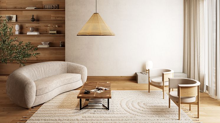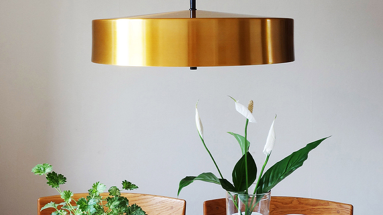 På bilden syns pendeln Cymbal, formgiven av Helena Svensson som hämtat inspiration från musikinstrumentets enkla form. Cymbal är en klassisk lampa, en sorts rumslig trofé där formgivaren hyllar ett gediget hantverk och ljuset får en vacker spridning. Pendeln finns i 2 storlekar, här 46 cm.