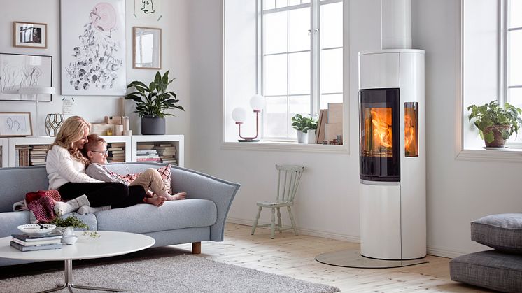 På bilden syns Contura 596G Style, som är en av Conturas populäraste modeller. Nu har den dessutom fått en spännande glaslucka, ännu större sidoljus och vit lack. Toppmonterad skorsten från Premodul.