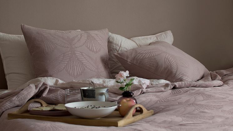 Här syns Design Lina Johansson's överkast och kuddar Wings. Vävda av 100% bomull med en blandning av olika sorters garner som ger fågelmönstret en härlig textur.