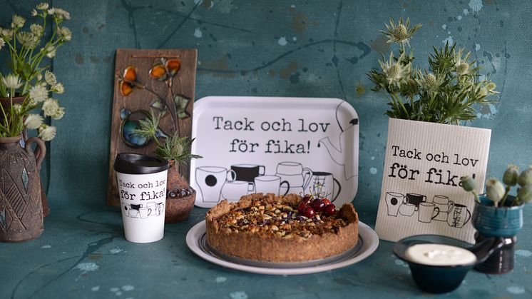 Här syns bricka, disktrasa och termomugg från erika tubbin’s kollektion TACK OCH LOV. Foto: Jessica Thyrén