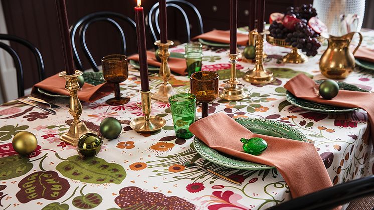 Här syns det ljuvliga motivet ”stensöta" i färgen apricot crush, som skapar en varm och inbjudande atmosfär vid matbordet. Motivet är handtryckt på melerat lin i storleken 145x145 cm, men kan även beställas i önskad storlek.