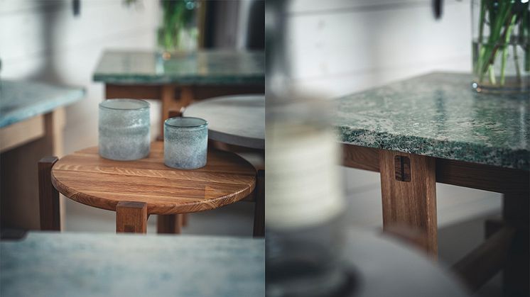 Ovan syns möbelserien L.B, en lekfull kollektion ritad av Eric Sturesson, framtagen i Ladugarden1898s egna snickeri. Genom ett samarbete med Borghamns Stenförädling erbjuds flertalet träslag och stensorter, vilket innebär att du själv kan vara delaktig i att designa din nästa möbel.