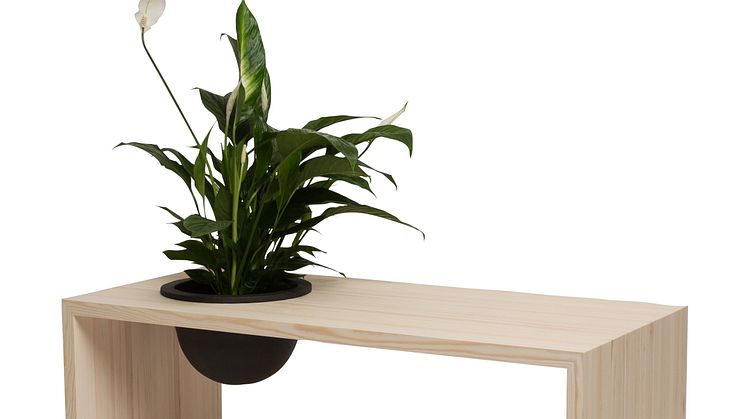 Här syns ett rektangulärt soffbord med kruka som ger växten en naturlig plats i vardagsrummet. Tillverkad i obehandlad furu med kruka i keramik som finns i vit eller svart.