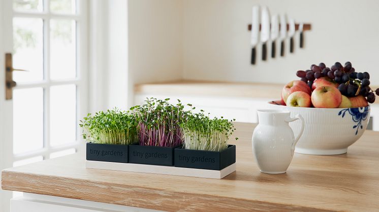 På bilden syns en miniköksträdgård från Tiny Gardens som gör det enkelt att odla läckra och hälsosamma, mikrogröna grönsaker på bara en vecka - året runt.
