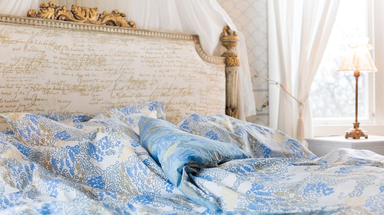 Här syns ett mjukt och lyxigt bäddset med mönstret Signe, tillverkat i 100% percalebomull som känns svalkande och behagligt mot huden. Påslakan och örngott är Oeko-Tex-certifierade.