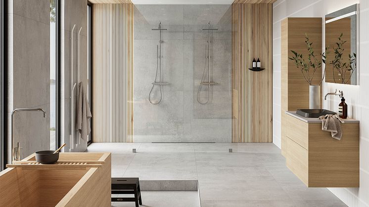 På bilden syns Walk-in-duschlösningen ARC 43 Original Plus, handdukstorken BOW samt kommoden ur serien GRAND Solid 100 i Nordic Oak med bänkskivan Raw Concrete i kvartskomposit.