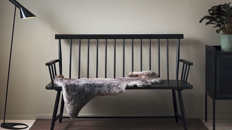 På bilden syns Lönelid pinnsoffa, Hissö sideboard och Viken matta från 1898 by Svenssons i Lammhult. En styling som kan fungera perfekt för att skapa en välkomnande och samtidigt stilren entré.