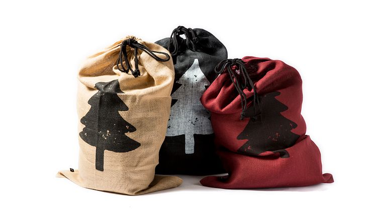På bilden syns julklappssäckar i färgerna natur, svart och röd. Det är lyxiga säckar i jute som erbjuder en perfekt plats att förvara julens alla klappar och som med sin fina design gärna kan stå framme hela julen!