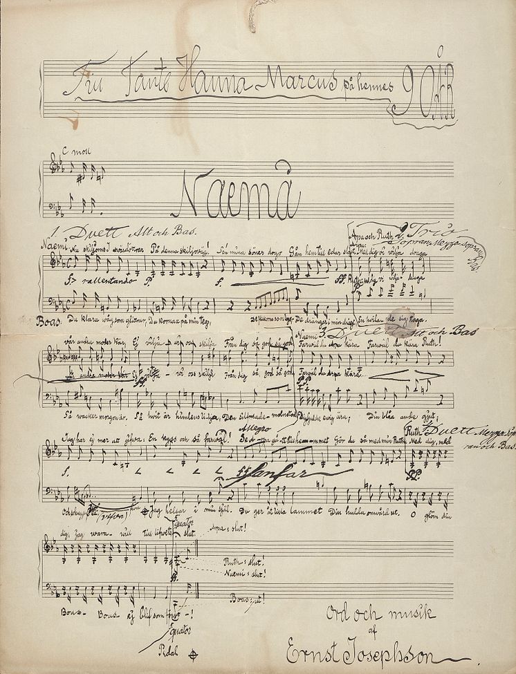 • Ernst Josephson, Naema, Festkantat med bön att sjungas vid Hanna Marcus 90-årsfödelsedagsfest. Noter från Nationalmuseums arkiv.
