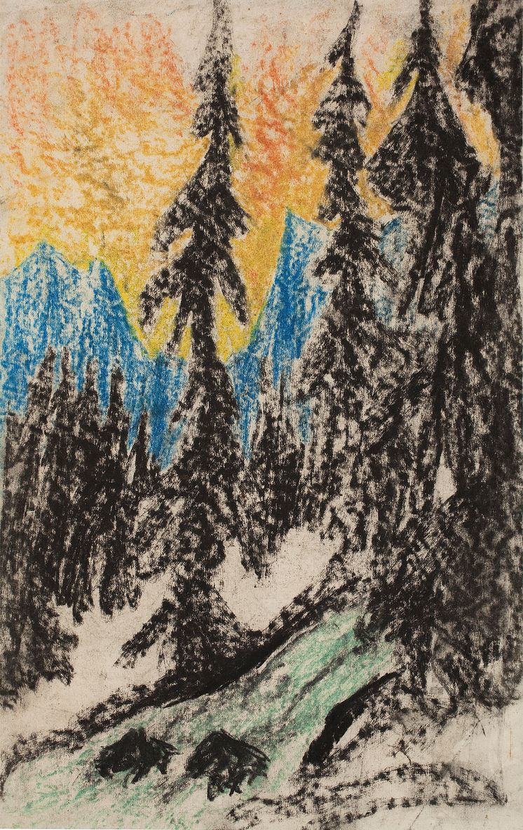 • Carl Fredrik Hill, Granskog, odaterad. Krita på papper, 36,5 x 22,5 cm.