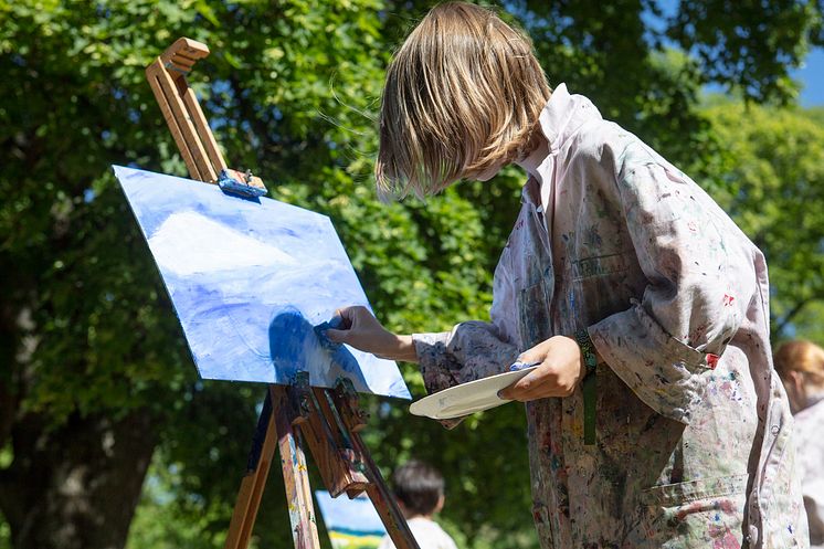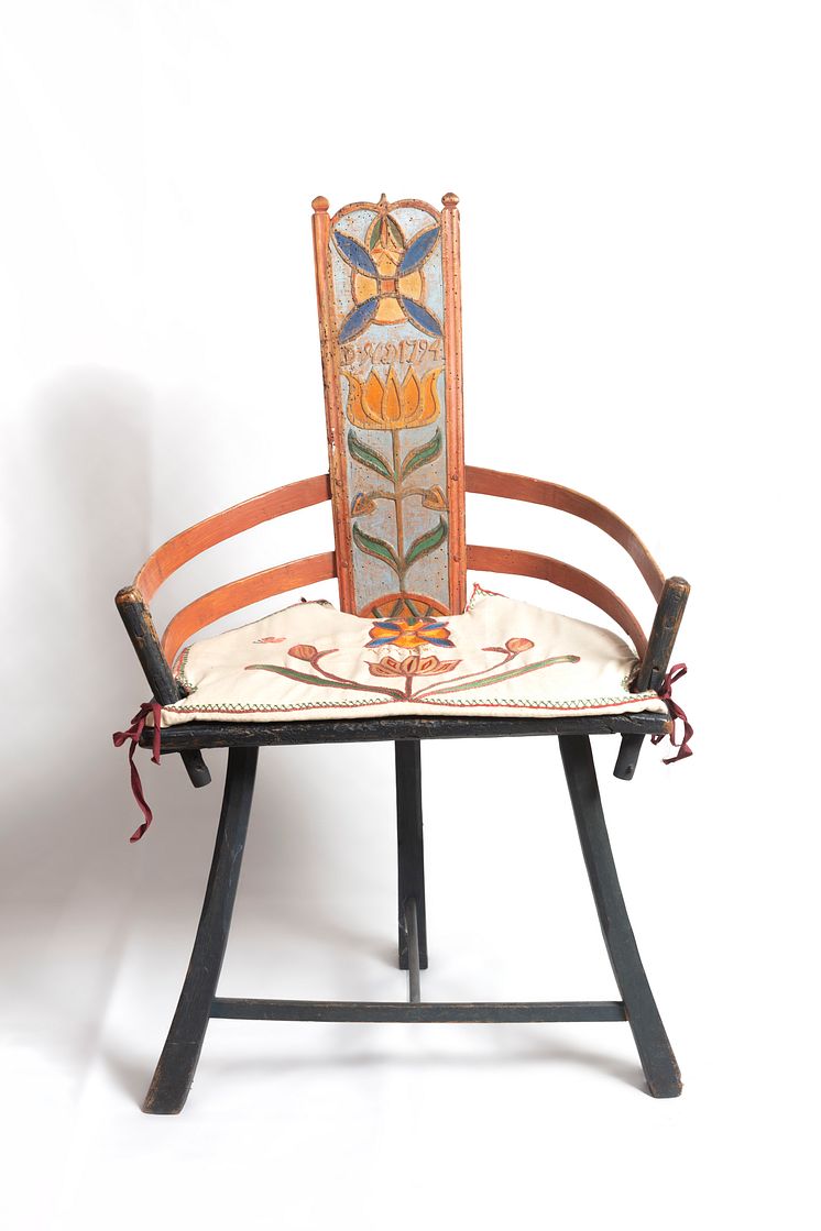 • Marie Krøyer, Kopia av äldre allmogestol med ryggen dekorerad av en stiliserad blomma, odat. Bemålat trä.