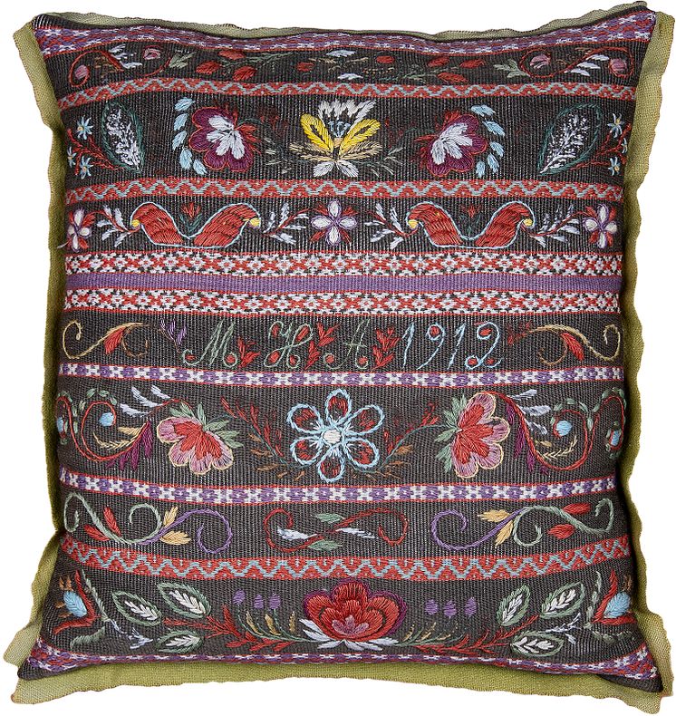 • Marie Krøyer, Broderad kudde med monogram MHA, 1912. Lin och lintråd, 53,5 x 51 x 16 cm.