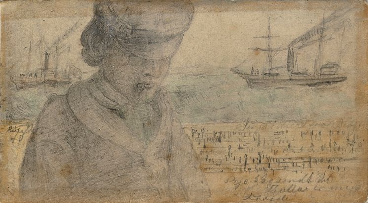 • Lars Hertervig, Antatt selvportrett, 1858. Blyerts och akvarell på papper, 6 x 11 cm.