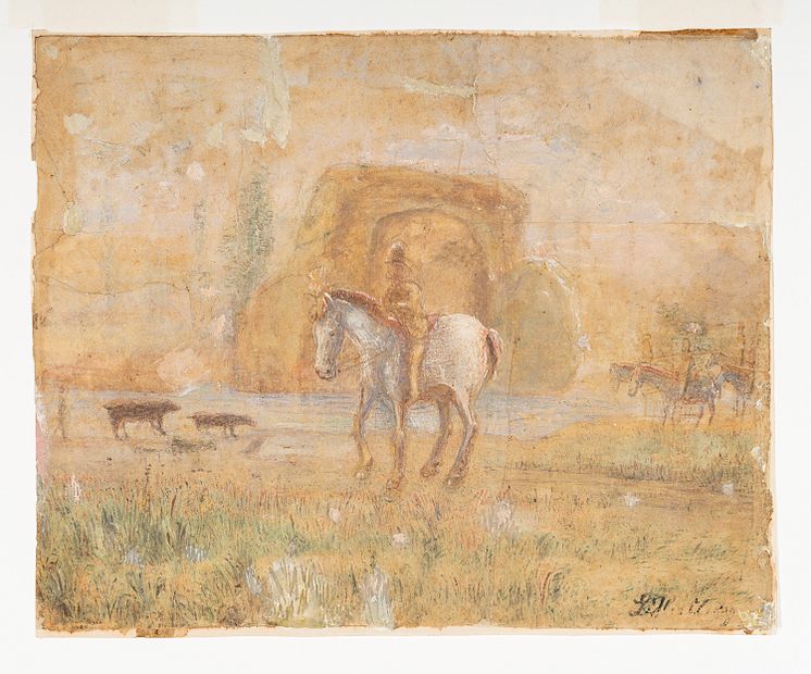 • Lars Hertervig, Landskap med ryttere, 1890-tal. Akvarell och gouache på papper, 25 x 30,7 cm.