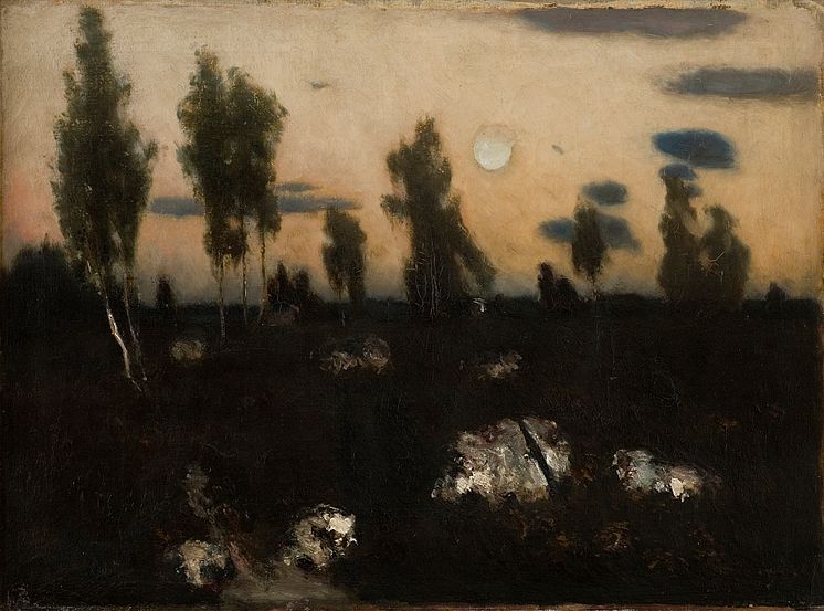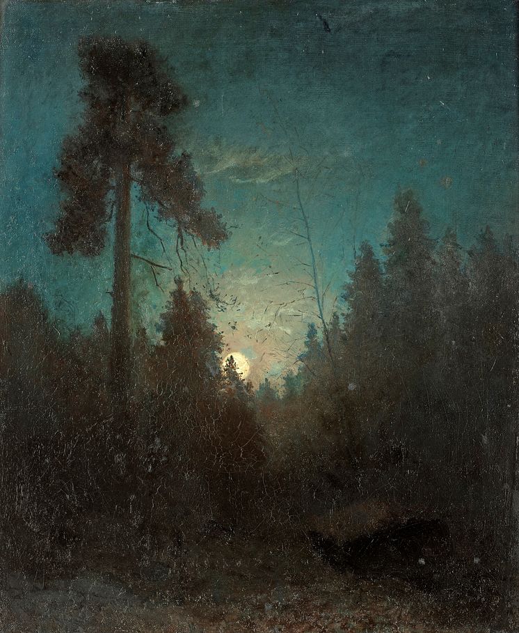 • Carl Fredrik Hill, Månsken med uppskjutande tall, omkr. 1875, Olja på duk, 55,5 x 46 cm.