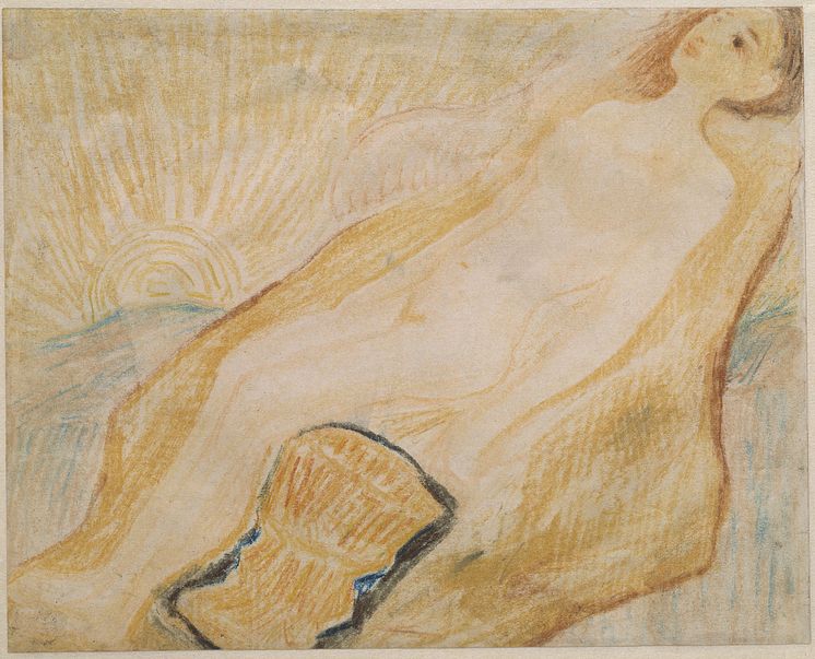 • Carl Fredrik Hill, Naken kvinna i vilstol, uppgående sol (Etherseglingsmotiv), odaterad. Färgkrita på papper, 17 x 21 cm.