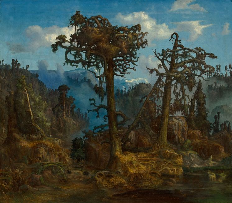 • Lars Hertervig, Gamle Furutrær, 1865. Olja på duk, 64 x 74,5 cm.