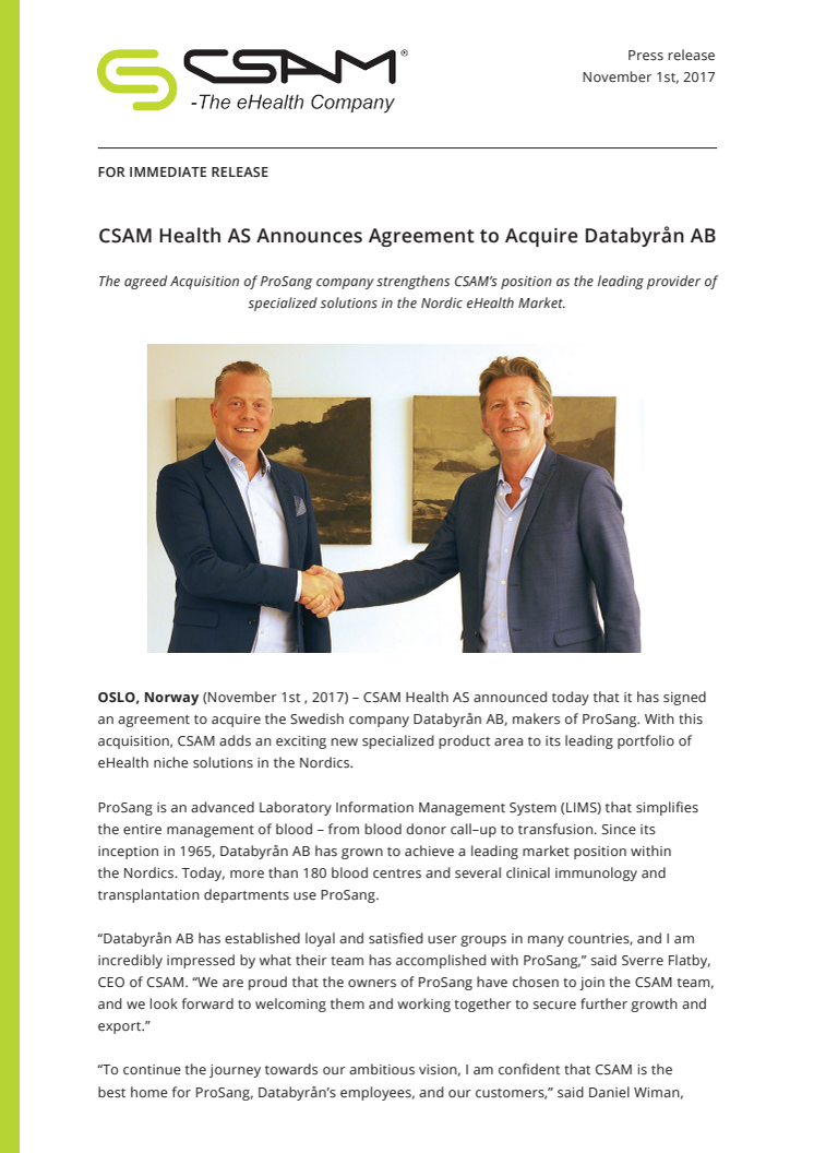 CSAM Health har förvärvat det svenska bolaget Databyrån AB, tillverkare av ProSang - ett avancerat laboratorieinformationssystem som förenklar hantering av blod, från blodgivare till transfusion. I och med förvärvet lägger CSAM till ett nytt spännande specialiserat produktområde till sin ledande portfölj av nischade e-hälsolösningar i Norden.