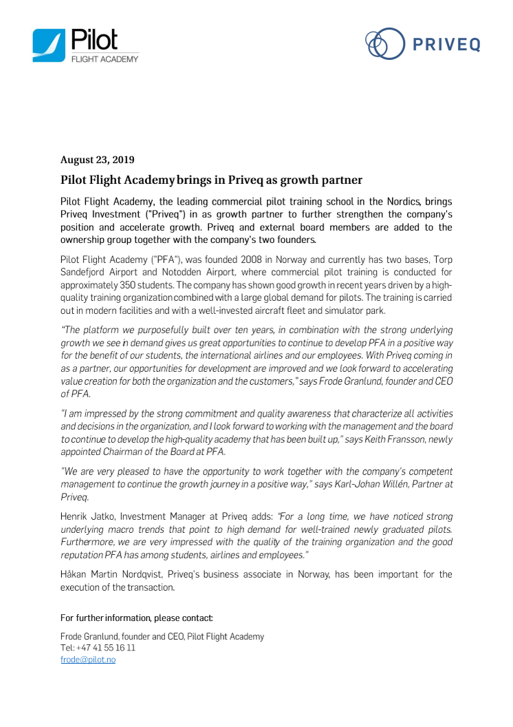 Pilot Flight Academy, the leading commercial pilot training school in the Nordics, brings Priveq Investment in as growth partner to further strengthen the company's position and accelerate growth. Priveq and external board members are added to the ownership group together with the company's two founders.
