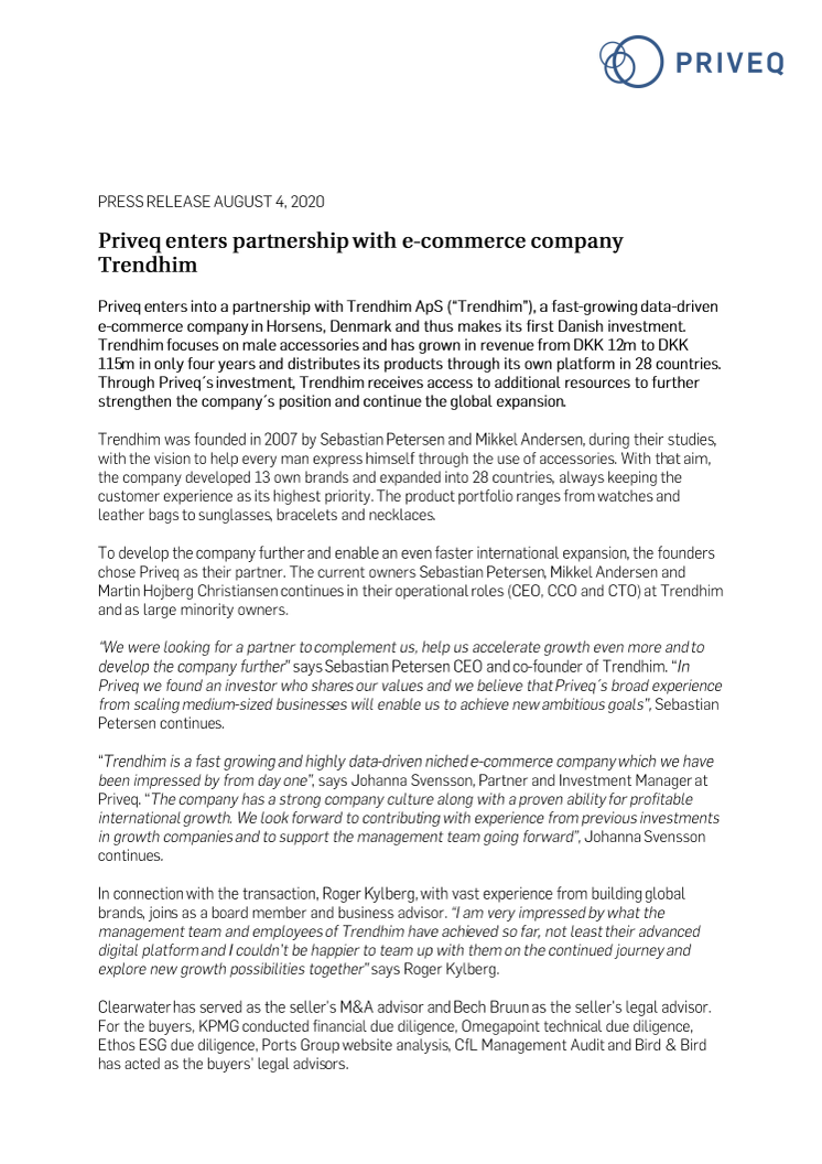 Priveq enters into a partnership with Trendhim ApS, a fast-growing data-driven e-commerce company in Horsens, Denmark and thus makes its first Danish investment. . Through Priveq´s investment, Trendhim receives access to additional resources to further strengthen the company´s position and continue the global expansion.