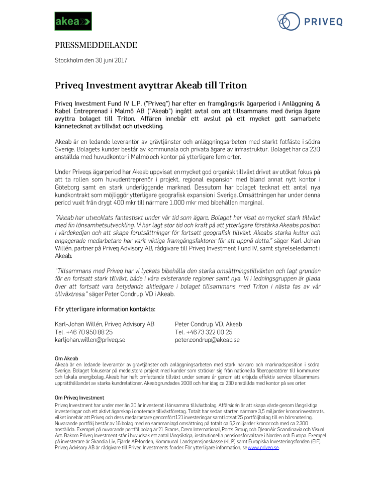 Priveq Investment Fund IV L.P. har efter en framgångsrik ägarperiod i Anläggning & Kabel Entreprenad i Malmö AB (”Akeab”) ingått avtal om att tillsammans med övriga ägare avyttra bolaget till Triton. Affären innebär ett avslut på ett mycket gott samarbete kännetecknat av tillväxt och utveckling.