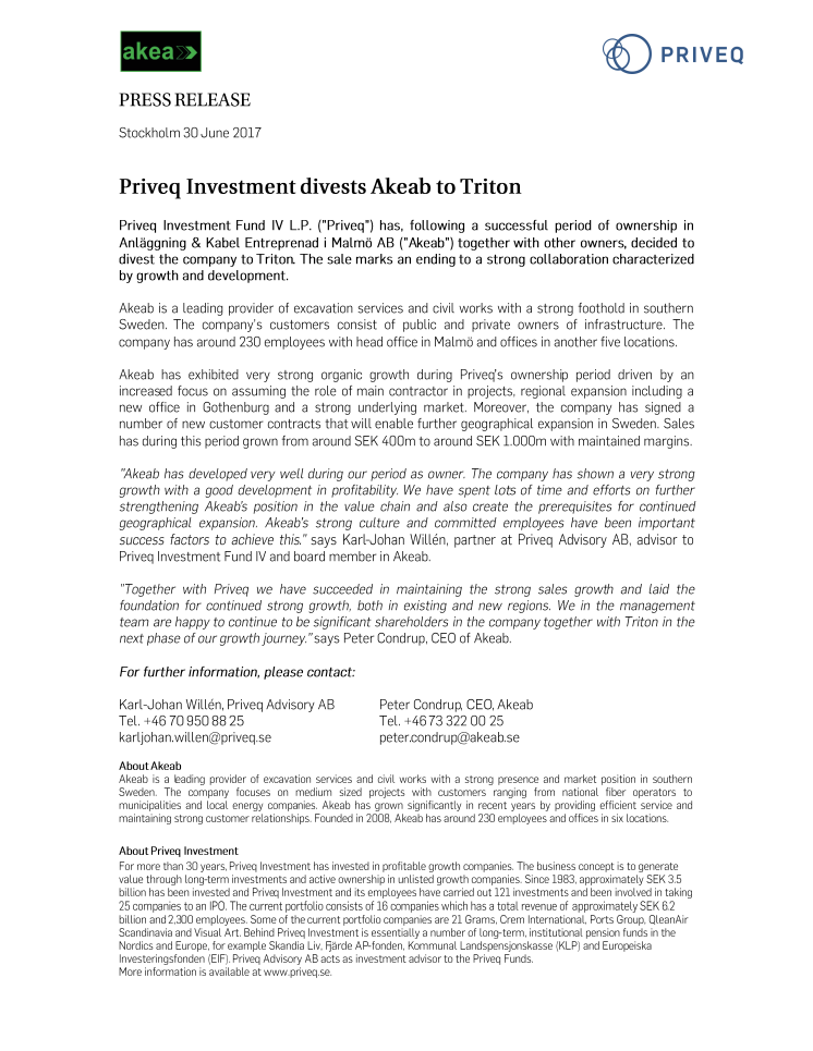 Priveq Investment Fund IV L.P. has, following a successful period of ownership in Anläggning & Kabel Entreprenad i Malmö AB (”Akeab”) together with other owners, decided to divest the company to Triton. The sale marks an ending to a strong collaboration characterized by growth and development.