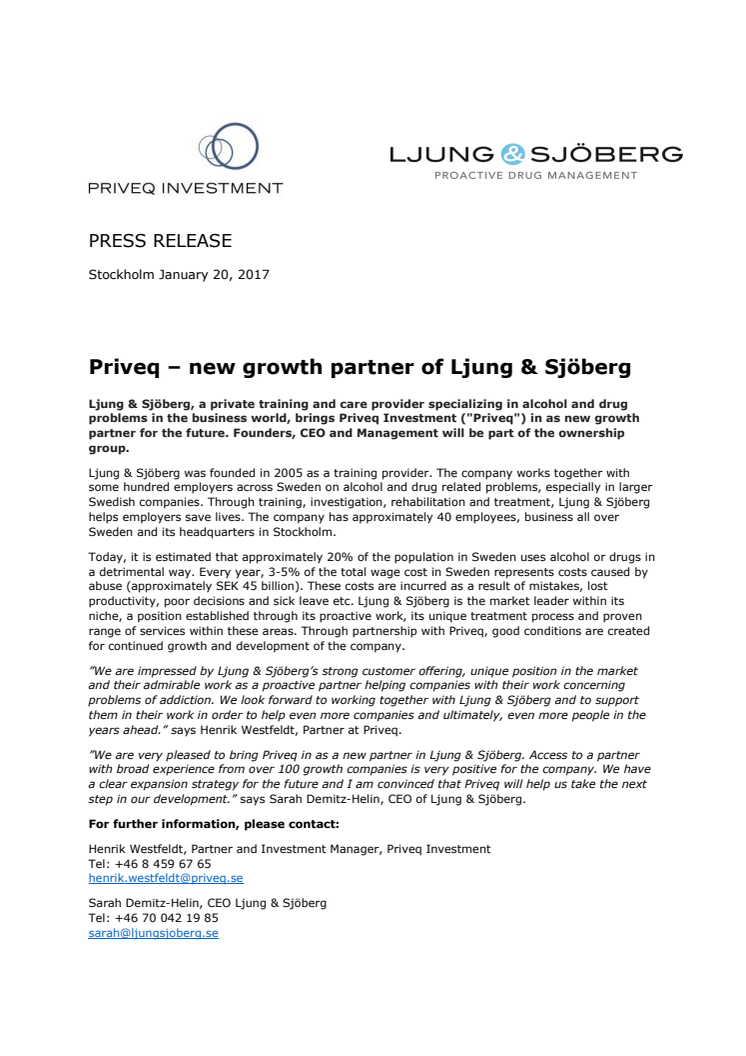 Ljung & Sjöberg, a private training and care provider specializing in alcohol and drug problems in the business world, takes Priveq Investment in as new growth partner for the future. Founders, CEO and Management will be part of the ownership group.