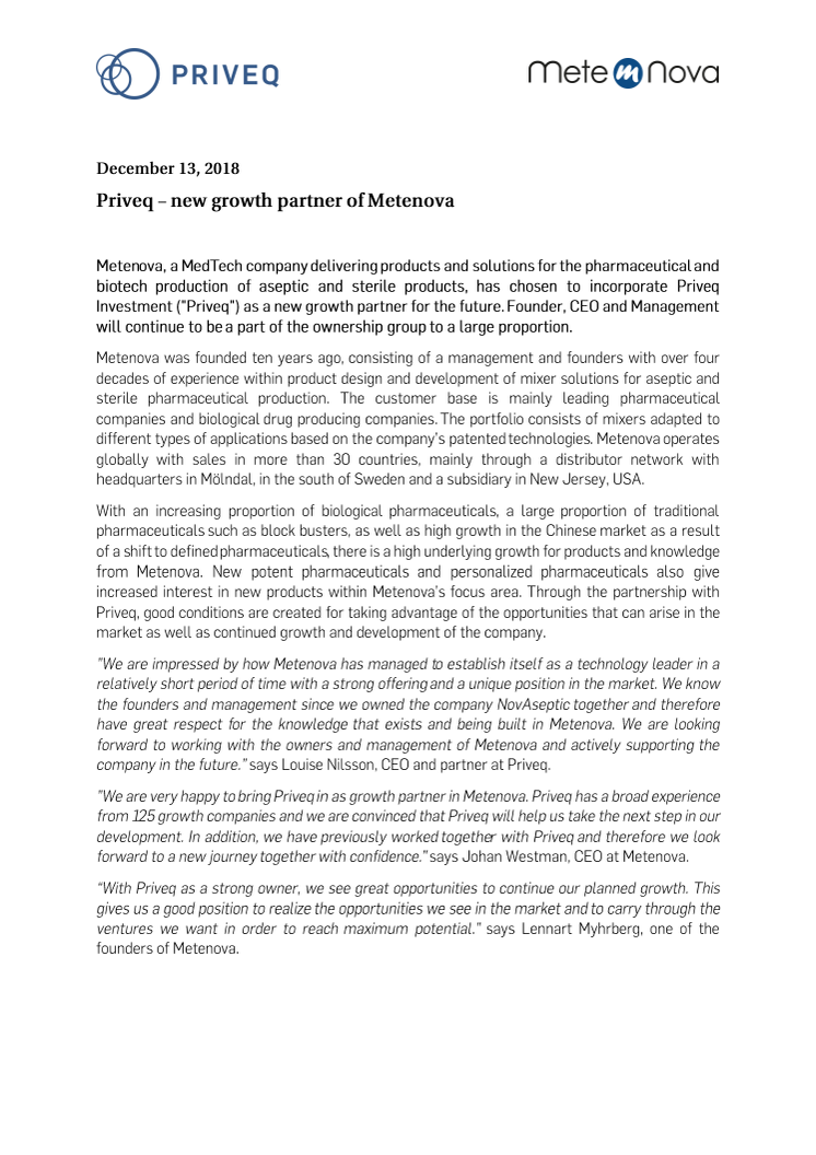 Metenova, a MedTech company delivering products and solutions for the pharmaceutical and biotech production of aseptic and sterile products, has chosen to incorporate Priveq Investment as a new growth partner for the future. Founder, CEO and Management will continue to be a part of the ownership group to a large proportion.