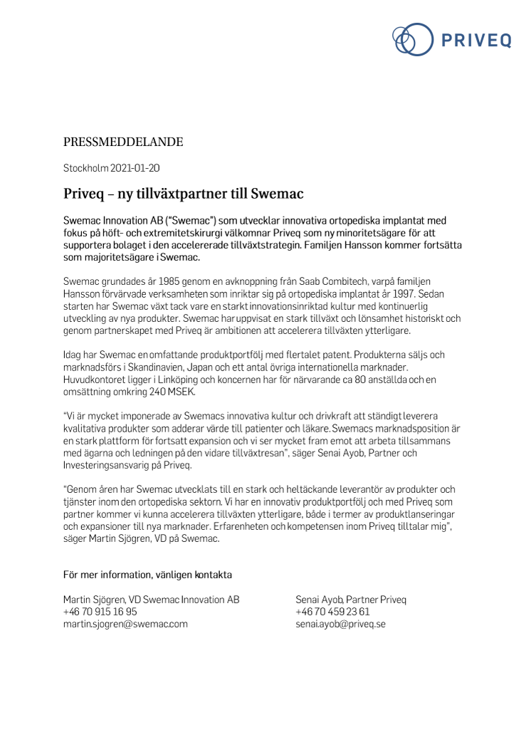 Swemac Innovation AB (“Swemac”) som utvecklar innovativa ortopediska implantat med fokus på höft- och extremitetskirurgi välkomnar Priveq som ny minoritetsägare för att supportera bolaget i den accelererade tillväxtstrategin. Familjen Hansson kommer fortsätta som majoritetsägare i Swemac.
