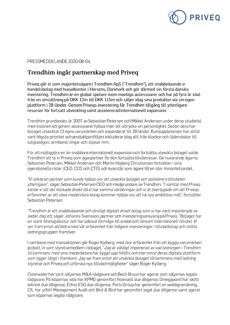 Priveq går in som majoritetsägare i Trendhim ApS, ett snabbväxande e-handelsbolag med huvudkontor i Horsens, Danmark och gör därmed sin första danska investering. Genom Priveqs investering får Trendhim tillgång till ytterligare resurser för fortsatt utveckling samt accelererad internationell expansion.