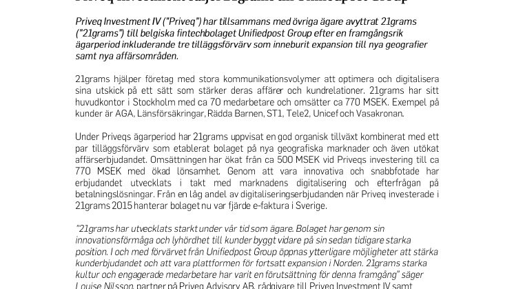 Priveq Investment IV (”Priveq”) har tillsammans med övriga ägare avyttrat 21grams (”21grams”) till belgiska fintechbolaget Unifiedpost Group efter en framgångsrik ägarperiod inkluderande tre tilläggsförvärv som inneburit expansion till nya geografier samt nya affärsområden.