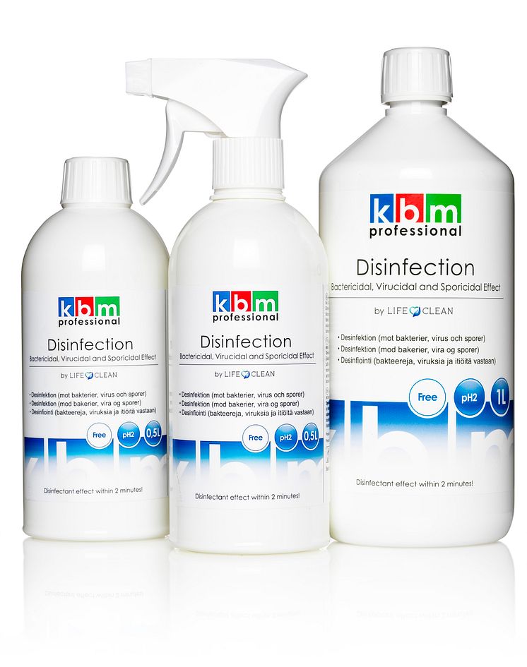 Ytdesinfektionsmedel KBM Disinfection by LifeClean är effektivt mot virus som coronavirus, norovirus, bakterier, antibiotikaresistenta bakterier, sporer med mera.