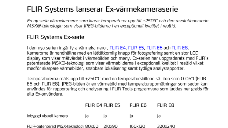I den nya serien ingår fyra värmekameror, FLIR E4, FLIR E5, FLIR E6 och FLIR E8. Kamerorna är handhålla med en lättåtkomlig knapp för fotografering samt en stor LCD display som visar mätvärdet i värmebilden och meny. Ex-serien har uppgraderats med FLIR´s patenterade MSX®-teknologi som visar värmebilderna i exceptionell kvalitet i realtid vilket medför skarpare värmebilder, snabbare lokalisering samt tydliga analysrapporter.