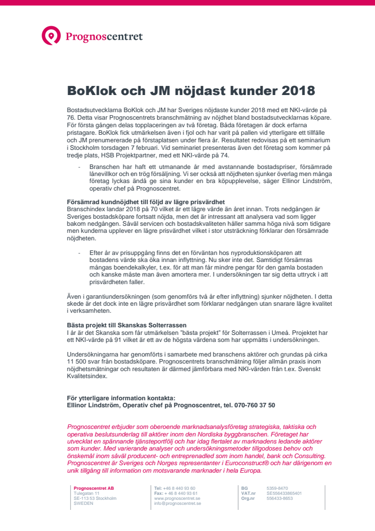 Bostadsutvecklarna BoKlok och JM har Sveriges nöjdaste kunder 2018 med ett NKI-värde på 76. Detta visar Prognoscentrets branschmätning av nöjdhet bland bostadsutvecklarnas kunder. På tredje plats kommer HSB Projektpartner, med ett NKI-värde på 74. Årets bästa projekt är Solterrassen, uppfört av Skanska.