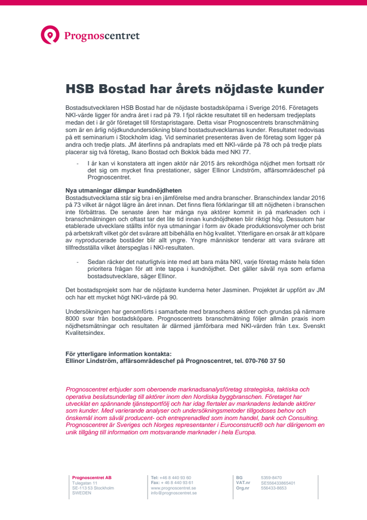Med ett NKI-värde på 79 är HSB Bostad bostadsutvecklaren med högst kundnöjdhet i Sverige 2016. På andra plats återfinns JM med ett NKI-värde på 78 medan Ikano Bostad och Boklok delar tredjeplatsen med NKI 77. Detta visar Prognoscentrets branschmätning som är en årlig nöjdkundundersökning bland bostadsutvecklarnas kunder.
