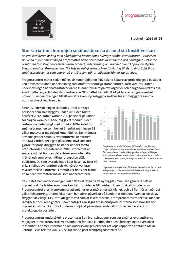 Bostadskvaliteten är hög men pålitligheten brister bland Sveriges småhusleverantörer. Branschen skulle vinna mycket på bättre bemötande och pålitlighet. Det visar resultat från Prognoscentrets unika undersökning om nöjdhet bland köpare av styckebyggda småhus. Branschen fläckas av dåligt rykte och en förklaring är att vissa leverantörer agerar på ett sätt som gör att köparna känner sig otrygga.