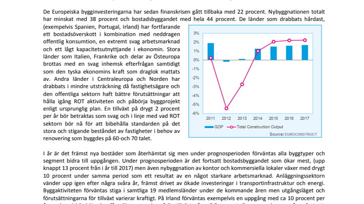 De Europeiska bygginvesteringarna har sedan finanskrisen gått tillbaka med 22 procent. Nybyggnationen totalt har minskat med 38 procent och bostadsbyggandet med hela 44 procent. De länder som drabbats hårdast, (exempelvis Spanien, Portugal, Irland) har fortfarande ett bostadsöverskott i kombination med neddragen offentlig konsumtion, en extremt svag arbetsmarknad och ett lågt kapacitetsutnyttjande i ekonomin. Stora länder som Italien, Frankrike och delar av Östeuropa brottas med en svag inhemsk efterfrågan samtidigt som den tyska ekonomins kraft som draglok mattats av. Andra länder i Centraleuropa och Norden har drabbats i mindre utsträckning då fastighetsägare och den offentliga sektorn haft bättre förutsättningar att hålla igång ROT aktiviteten och påbörja byggprojekt enligt ursprunglig plan. En tillväxt på drygt 2 procent per år bör betraktas som svag och i linje med vad ROT sektorn bör nå för att bibehålla standarden på det stora och stigande beståndet av fastigheter i behov av renovering som byggdes på 60-och 70 talet.