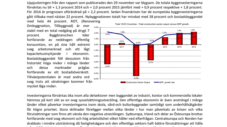Uppjusteringen från den rapport som publicerades den 29 november var blygsam. De totala bygginvesteringarna förväntas nu bli + 1,3 procent 2014 och + 2,0 procent 2015 jämfört med + 0,9 procent respektive + 1,8 procent. För 2016 är prognosen oförändrad på + 2,2 procent. Sedan finanskrisen har de europeiska bygginvesteringarna gått tillbaka med nästan 22 procent. Nybyggnationen totalt har minskat med 38 procent och bostadsbyggandet med hela 44 procent. ROT, (Renovering Ombyggnation, Tillbyggnad) är mer stabil med en total nedgång på drygt 7 procent. Byggbranschen lider fortfarande av neddragen offentlig konsumtion, en på sina håll extremt svag arbetsmarknad och ett lågt kapacitetsutnyttjande i ekonomin. Bostadsbyggandet föll dessutom från historiskt höga nivåer i många länder och dessa marknader präglas fortfarande av ett bostadsöverskott. Tillväxtpotentialen är med andra ord svag trots att vändningen kommer från mycket låga nivåer.