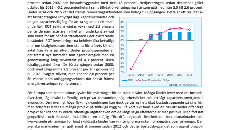 Uppgången i byggandet kommer från historiskt låga nivåer. Nybyggnationen i Europa har minskat med totalt 41 procent sedan 2007 och bostadsbyggandet med hela 48 procent. Nedjusteringen sedan december gäller utfallet för 2015, (-0,2 procentenheter) samt tillväxtförväntningarna i år som gått ned från 3,0 till 2,6 procent. Under 2014 och 2015 var det främst renoveringsaktiviteten som bidrog till uppgången. Detta är ett resultat av att fastighetsägare utnyttjat låga kapitalkostnader och en god kapacitetstillgång för att ta sig an ett eftersatt underhåll. ROT sektorn väntas växa med 1,5 procent per år de närmaste åren vilket är i underkant av vad som krävs för att behålla standarden i det existerande beståndet. ROT Investeringarna behöver öka betydligt mer om fastighetsbranschen ska ta förra årets klimatavtal från Paris på allvar. Under prognosperioden är det främst nya bostäder som agerar draglok med en genomsnittlig årlig tillväxttakt på 4,3 procent. Även lokalbyggandet ökar för första gången sedan 2008, dock med blygsamma 2,9 procent per år i genomsnitt till 2018. Svagast tillväxt, med knappt 2,8 procent per år, väntas inom anläggningssektorn där det är främst energiinvesteringar som bromsar.
