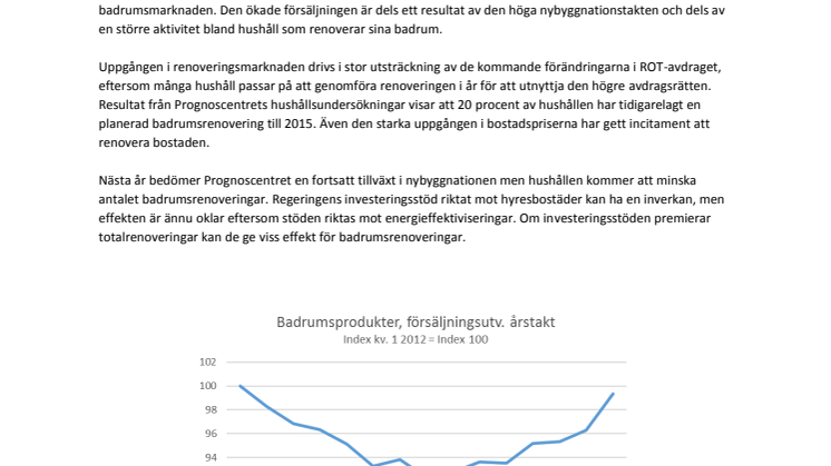 Uppgången i renoveringsmarknaden drivs i stor utsträckning av de kommande förändringarna i ROT-avdraget, eftersom många hushåll passar på att genomföra renoveringen i år för att utnyttja den högre avdragsrätten. Resultat från Prognoscentrets hushållsundersökningar visar att 20 procent av hushållen har tidigarelagt en planerad badrumsrenovering till 2015. Även den starka uppgången i bostadspriserna har gett incitament att renovera bostaden.