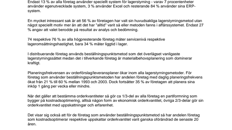 En mycket intressant sak är att 56 % av företagen har valt sin huvudsakliga lagerstyrningsmetod utan något speciellt motiv mer än att det har "alltid" varit så eller metoden fanns i affärssystemet. Endast 27 % angav att valet berodde på resultat av analys och bedömning.