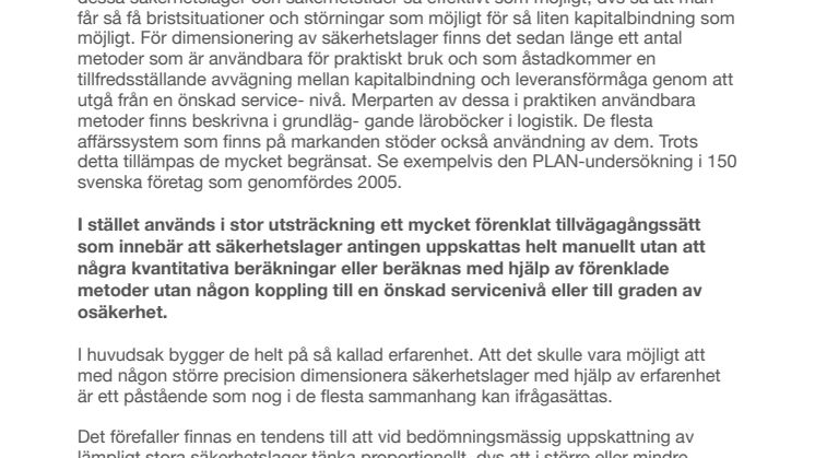 Forskare i lagerstyrning Stig-Arne Mattsson: "För att ett säkerhetslager skall kunna ge en önskad servicenivå med så låg kapitalbindning som möjligt måste det vara proportionellt mot efterfrågevariationerna under ledtid och stå i relation till en önskad servicenivå"
