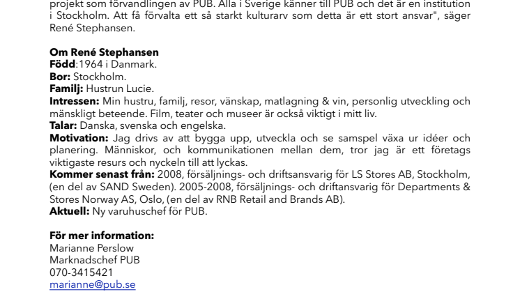 Klassiska varuhuset PUB, en shoppingdestination i Stockholm sedan 1882, har tillsatt en ny varuhuschef. René Stephansen kommer närmast från danska konfektionsbolaget Sand, där han har arbetat som etableringschef i Sverige.