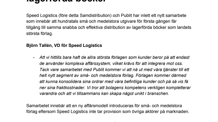Speed Logistics (före detta Samdistribution) och Publit har inlett ett nytt samarbete som innebär att hundratals små och medelstora utgivare för första gången får tillgång till samma snabba och effektiva distribution av lagerförda böcker som landets största förlag.
