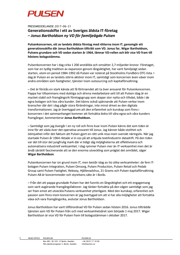 Pulsenkoncernen, ett av landets äldsta företag med rötterna inom IT, genomgår ett generationsskifte där Jonus Bartholdson tillträtt som VD. Jonus far, Wigar Bartholdson, Pulsens grundare och VD sedan starten år 1964, lämnar VD-rollen och blir vice VD fram till höstens bolagsstämma.