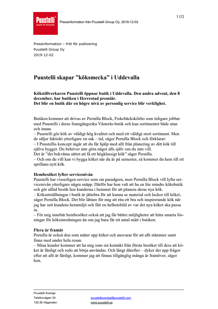 Kökstillverkaren Puustelli öppnar butik i Uddevalla. Den andra advent, den 8 december, har butiken i Herrestad premiär.